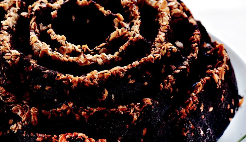 Kabak, ceviz ve rendelenmiş çikolatayı kattıktan sonra tüm malzemeyi birbiriyle özleşecek şekilde karıştırın. Gül şeklindeki bir kalıbın dibini yağlayıp, yulaf ezmesi serpin ve karışımı içine boşaltın.