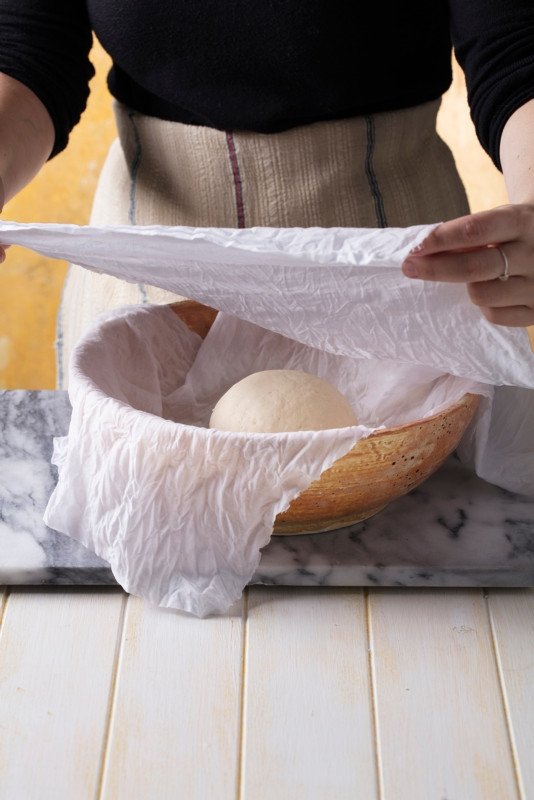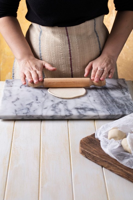 Hamuru nemli bir bezin içine koyup üzerini kapatın. 10 dakika oda sıcaklığında dinlendirin. Dinlenen hamuru düz bir zemine alıp 8-10 adet eşit parçaya bölün. Hamur parçalarını nemli bezin içinde bekletin.