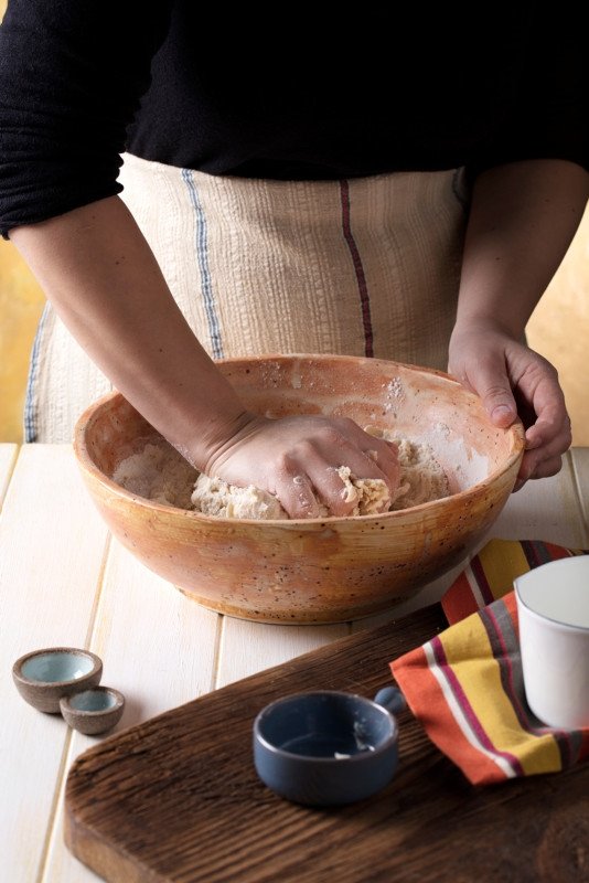 Derin bir kapta un, kabartma tozu ve tuzu karıştırın. Tereyağını ekleyip elinizle ezerek una yedirin. Ilık suyu da katıp hamur toparlanıp pürüzsüzleşene kadar yoğurun. Kıvamını alan hamura elinizle top şekli verin.
