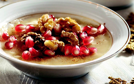 Aşçının notu: Sarayda hazırlanan bu aşureye o zamanlar ocaktan almadan hemen önce bir toplu iğne başı kadar misk de eklenirmiş. Misk: Asya'nın yüksek dağlarında yaşayan bir tür erkek ceylanın karın derisi altındaki bir bezden çıkarılan güzel kokulu maddedir.
