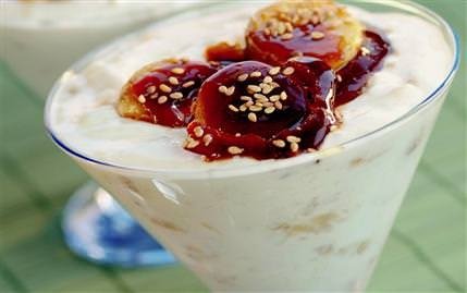 6 adet pişirmelik muz, 1 adet limon, 2 su bardağı tozşeker, 1-2 çorba kaşığı susam, 1 su bardağı pudraşekeri, yarım kg süzme yoğurt, 3 çorba kaşığı krema, 1 adet portakalın rendelenmiş kabuğu