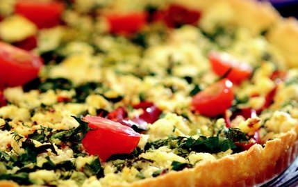 Hamur için margarin, un, yoğurt ve kabartma tozunu yoğurun. Orta büyüklükte bir tart kalıbının içine kenarlarını kaplayacak şekilde yayın. İçi için bir kasede lor peyniri, dörde bölünmüş kiraz domates, ince kıyılmış sivri biber, maydanoz, dereotu ve nane ile taze soğanı karıştırın. Hamurun üzerine yayın. Bir kapta yumurta ve sütü çırpın. Karışımın her tarafına gelecek şekilde dökün. Önceden ısıtılmış 175 derece fırında hamur kızarana kadar pişirin. Ilınınca dilimleyerek servis yapın.