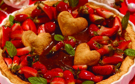 Pudraşekeri ve tereyağını iyice karıştırın. Üzerine yumurta sarısı, kakao ve kabartma tozu ilave edin. Azar azar un ekleyerek kulak memesi yumuşaklığında bir hamur hazırlayın. Daha sonra yarım saat dinlendirin. Hamurun 1/3'ünü kenara ayırıp, kalanını merdane yardımı ile açın. Hamuru orta boy bir tart kalıbının kenarlarını da kaplayacak şekilde içine yerleştirin. İçi için, kremayı ısıtıp üzerine küçük parçalar halinde kırdığınız çikolata, rendelenmiş portakal kabuğu, tereyağı ve tarçın ekleyin. Ocaktan alıp ılındıktan sonra tartın üzerine dökün. Kalan hamuru açıp tartın üzerini kapatın. Önceden ısıtılmış 180 derece fırında 20-30 dakika pişirin. 150 gram bitter çikolatayı benmari usulü eritin. İçine kremayı ekleyip soğuyan tartın üzerini ve yanlarını kaplayın. Krokanı hazırlamak için su ve tozşekeri bir tavaya alın. Kısık ateşte şeker eriyip karamel rengi olana kadar pişirip ocaktan alın. İçine kırılmış fındık ekleyip karıştırın. Bekletmeden yağlı kağıt serilmiş düz bir zemine dökün. Donduktan sonra parçalar halinde kırın. Üzerindeki çikolata donan tartı, krokan ve çilek dilimleri ile süsleyerek servis yapın.
