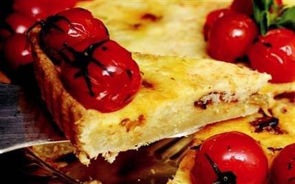 Yarım paket margarin (1 paket margarin 125 gram), 12 çorba kaşığı un, 2 çorba kaşığı yoğurt, 1 paket kabartma tozu, 1 çay kaşığı tuz, ara malzeme için: 2 adet patlıcan, 2 çorba kaşığı sıvıyağ, 200 ml krema 2 adet yumurta, 1 çay kaşığı tuz, yarım çay kaşığı karabiber, 100 gram gravyer peyniri, üst malzeme için: 20-30 adet kiraz domates, 1 çay kaşığı zeytinyağı, 1 tatlı kaşığı tozşeker, 2-3 adet fesleğen yaprağı, tuz