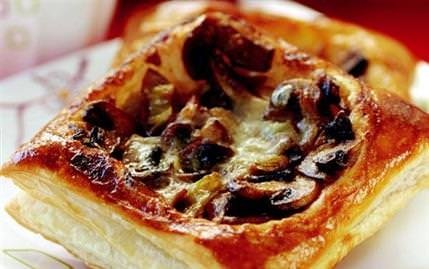 Mantarların zarını soyun ve incecik doğrayın. Kıyılmış soğanla birlikte bir tavaya alın. Tuz, karabiber ve pulbiber ekleyip, kısık ateşte 5 dakika soteleyin. Ocaktan alın ve krema ilave edin. Milföylerin ortasına mantarlı harçtan koyun. Kenardaki açık kısımlara yumurta sarısı sürün. Önceden ısıtılmış 175 derece fırında börekler kabarana kadar pişirin. Tepsiyi fırından çıkarıp, kaşar peyniri serpin. Tekrar sıcak fırında kaşar eriyene kadar tutun ve çıkarın. Sıcak olarak servis yapın.