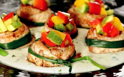 Hindi etlerini 2 parmak eninde şeritler halinde doğrayın ve döverek inceltin. 1 çorba kaşığı zeytinyağı, karabiber, kırmızıbiber ve tuzu karıştırıp hindi etlerini ovun. İki şeridi kürdanla tutturup birbirine ekleyin ve ortası boş bir yuva haline getirin. Fırın tepsisine dizip önceden ısıtılmış 200 derecelik fırında 15 dakika pişirin. Diğer taraftan küp doğradığınız biberleri ve kabağı 2 çorba kaşığı zeytinyağında 10 dakika sote edin. Beşamel sos için, kızdırdığınız yağa un ekleyip 1-2 dakika kavurun. Sütü ilave edip sürekli karıştırarak koyulaşana kadar pişirin. Kaşar, maydanoz, karabiber ve tuzu ekleyip bir kez daha karıştırın ve ocaktan alın. Bir servis tabağına beşamel sosu döküp hindi yuvalarını üstüne yerleştirin. Taze soğanların yeşil kısımlarını sıcak suda 1-2 dakika tutup soğuk suya batırın ve suyunu süzün. Yuvaların içine, hazırladığınız sebzeli karışımdan doldurun. Hindi yuvalarını tutturduğunuz kürdanları çıkartıp bir sap taze soğanla etraflarını bağlayın. Sıcakken servis yapın.