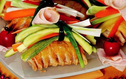 6 parça milföy hamuru, 1 adet yumurtanın sarısı, 2’şer adet havuç ve kabak, 1 adet salçalık kırmızı biber, 6 adet taze soğan, 6 dilim hindi füme, 5-6 adet kiraz domates, tuz