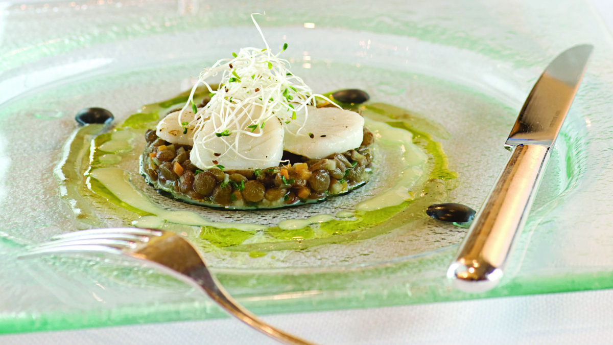 Dairesel bir kalıp yardımıyla servis tabağına yerleştirin. Üzerine haşlanmış deniz tarağı, balık fileto veya ızgara sebzeler koyabilirsiniz. Zeytinyağı gezdirip mikro filizlerle süsleyerek servis yapın.
