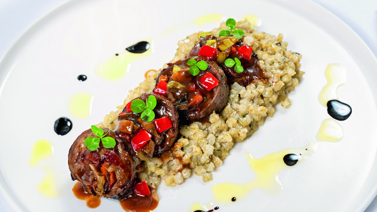 Keşkek için buğday ve nohudu düdüklü tencereye alın. Üzerine et ve tuz ilave edin. Su ekleyin. Kapağını kapatıp 50 dakika kısık ısıda pişirin. Tahta kaşık ya da keşkek döveceği ile iyice ezin. Üzeri için tereyağını eritin ve üzerine biber salçasını ekleyin. Salçanın kokusu çıkana kadar kısık ateşte kavurun. Keşkeği servis tabağına alın. Üzerine sostan gezdirin. Eti yerleştirin. Dilediğiniz şekilde süsleyin. Demiglace sos gezdirip servis yapın.