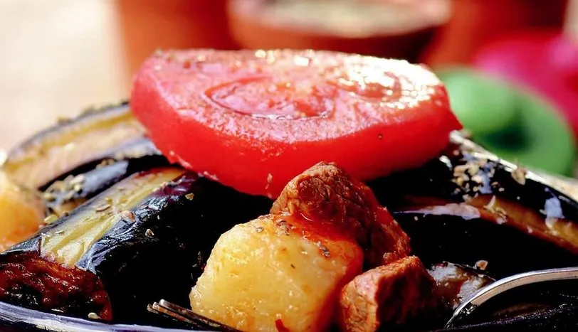Güveç kabının dibine eti yerleştirin. Derin bir kasede kuşbaşı doğranmış kabak, havuç, patates, domates, biber salçası, arpacık soğan, sıvıyağ, tuz, karabiber ve pulbiberi karıştırın. Bu karışımı etlerin üzerine boşaltın. Patlıcanları alacalı soyup, acısını almak için tuzlu suda 15 dakika bekletin. Suyunu süzüp, iyice kurulayın. Daha sonra dörde bölün ve sebzeli karışımın üzerine dizin. Güvecin ağzını alüminyum folyo ile kapatın. Önceden ısıtılmış 150 derece fırında 2 saat pişirin.