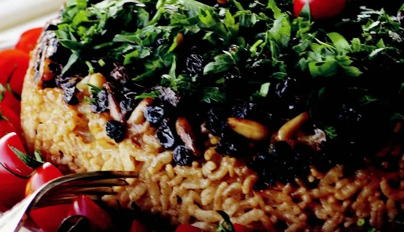 Pirinci tuzlu ılık suda yarım saat bekletin. Sonrasında suyunu süzdürüp iyice yıkayın. Kuşüzümlerinin saplarını temizleyip, şişmesi için, yarım saat ılık suda bekletin. Kakulelerin kabuklarını ayırıp, tohumlarını havanda dövün. Geniş bir tencerede önce tereyağının yarısını eritin ve eti kavurun. Et, suyunu bırakıp tekrar çekince, soğanı ekleyin. Hafif tuzlayın ve pembeleşene dek kavurun. Tencereye 1 su bardağı su ilave edin. Etin suyunu arada bir kontrol edip, yumuşayıncaya dek, kısık ateşte 45 dakika pişirin. Et pişince tenceredenalıp fazla suyunu süzün ve pilavı pişireceğiniz yayvan bir tencereye aktarın. Üzerine pirinç ve et suyu hariçkalan malzemeyi katıp, karıştırın. Yıkanmış pirinci etin üzerine döküp yayın ve hiç karıştırmadan kaynamışet suyunu ilave edin. Kapağı kapalı olarak kısık ateşte, pirinç suyunu çekene dek pişirin. Pilavı ateşten alın,tencerenin ağzını bezle ya da kağıt havluyla örtün ve kapağını sıkıca kapatıp 20 dakika demlendirin. Servistabağına ters çevirip, sıcak servis yapın.