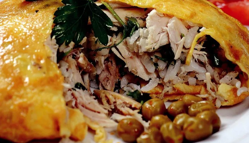 Tavuğu haşlayıp elinizle didikleyin ve kenara alın. Yağı bir tencereye alıp kızdırın. Üzerine yıkanıp süzülmüş pirinci ve dolmalık fıstığı ekleyip, pembeleşene kadar kavurun. Daha sonra üzerini bir parmak geçecek kadar sıcak su ve tavuk bulyon ekleyin. Tuz ve karabiber ilave edin. Didiklenmiş tavuk etini katın. Pilav suyunu çekene kadar pişirin. Altını kapatıp üzerine kıyılmış maydanoz ekleyin. Pilavın üzerine kağıt havlu koyup kapağı kapalı olarak, 10 dakika demlenmeye bırakın. Diğer taraftan yumurtaları çırpıp, her birinden birer adet omlet yapın. Omletler hazır olunca bir tanesini alıp, bir kasenin içine yerleştirin. Ortasına pilav koyup kenarlarını toplayın ve ters çevirerek bir fırın tepsisine yerleştirin. Kalan omletleri de bu şekilde hazırlayın. Önceden ısıtılmış 180 derece fırında, 10 dakika pişirin. Haşlanmış bezelye, domates ve biber dilimleri eşliğinde servis yapın.