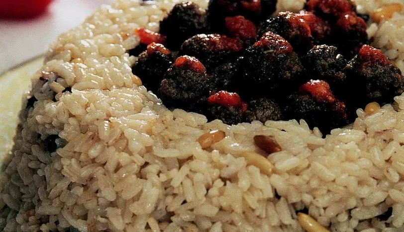 Öncelikle pirinci sıcak tuzlu suda ıslatın. Nişastası gidene kadar bol soğuk su ile yıkayın. Tencereye 2 çorba kaşığı tereyağı, suyu, tuzu, şekeri, defne yaprağını koyun. Kaynayınca süzülmüş pirinci atın. Karıştırın. Ocağı kısın. Pirinç suyunu çekene kadar pişirin. Diğer tarafta köfte için un ve sıvı-yağ hariç bütün malzemeyi (ekmek içi ıslatılıp, suyu sıkılmış olacak) yoğurun. Kiraz büyüklüğünde köfteler yapın. Una bulayın. 2 çorba kaşığı sıvı yağda, tavayı sallayarak kızartın. Pilavı yuvarlak bir kalıba koyun. Servis tabağına ters çevirin. Ortasına köfteleri yerleştirin. Sosu hazırlayın. Bunun için sos malzemesini (su hariç) soteleyin. En son suyu ilave edip, bir taşım kaynatın. Köftelerin üzerine gezdirip, sıcak servis yapın.