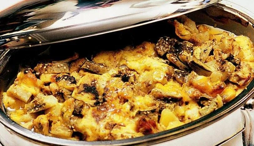 Temizlenmiş hindiyi bir tencereye alın. Üzerine portakal suyu ve suyu ekleyin. Tuzunu ve biberini ayarlayıp hindiyi pişirin. Hindi suyunu daha sonra kullanmak için bir kenara ayırın. Hindiyi küçük parçalara ayırın. Diğer tarafta enginarları limonlu suda bekletin. Enginarları ve ananasları kuşbaşı doğrayın. Fırın kabına önce enginarları dizin. İkinci kat olarak ananasları dizin. Üçüncü kat olarak hindi parçalarını dizin. Tuz, karabiber ve zencefil ekleyip, üzerini kaşar peyniri dilimleriyle örtün. Hindi suyunu ekleyin. Fırın kabının üzerini folyo ile kapatın. Önceden ısıtılmış 200 derece fırında 20 dakika pişirin. Sıcak servis yapın.