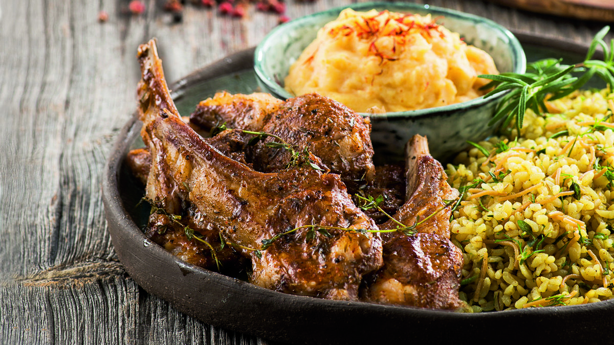 Patates püresi için patatesleri tuz eklediğiniz bol suda yumuşayana kadar haşlayın. Kabuklarını temizleyip geniş bir kaba alın. Tereyağı ilave edip ezerek karıştırın. Ezerken bir taraftan da oda ısısındaki sütü ekleyin. Tuz, zerdeçal, muskat, toz kırmızıbiber ve haspiri katıp iyice karıştırın. Pirzola, bulgur pilavı ve püreyi tabağa alıp sıcak olarak servis yapın.