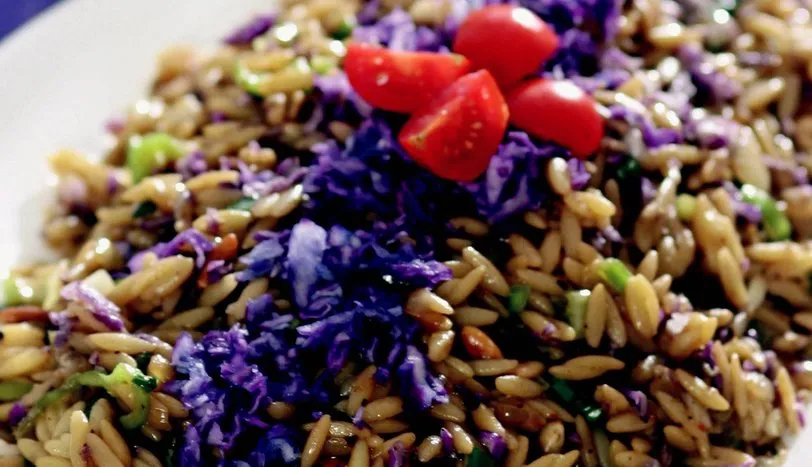 Arpa şehriyeyi 8 dakika haşlayıp süzün ve bir tencereye alın. Yemeklik doğranmış soğanı 2 çorba kaşığızeytinyağında kavurun ve şehriyenin içine katın. Taze soğan, sivri biber, soya sosu, kimyon ve pul biber ilave edin. Dolmalık fıstığı bir tavada hafif pembeleşene kadar kavurun. Tane karabiber, kırmızı lahana ve tuz ilebirlikte pilavın içine ilave edin. En son 2 çorba kaşığı zeytinyağını katıp bütün malzemeyi karıştırın. Servis tabağına alıp sıcak olarak servis yapın.AŞÇININ NOTUArzuya göre pilavı soğuk olarak da yiyebilirsiniz.