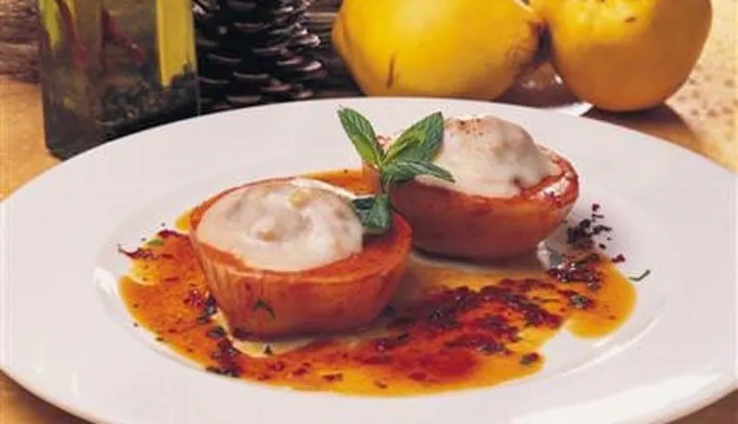 Öncelİkle 2 adet ayvayı ortadan ikiye bölün. 2 su bardağı suda haşlayın. Suyunu süzüp ayvaları ve suyunu ayrı kaplara alın. Diğer tarafta, bir tencerede 2 çorba kaşığı tereyağı, 1 tatlı kaşığı çamfıstığı, 1 çorba kaşığı ince kıyılmış soğan, 1 tatlı kaşığı kuşüzümü, sivribiber, kıyma ve 1 tatlı kaşığı salçayı kavurun. Tuz, kimyon, yenibahar, kırmızı tozbiber ve ayırdığınız su ilavesi ile bir taşım kaynatın. Ayvaların üzerine harcı dökün. Üzerine dilimlenmiş kaşar peynirini koyun. 180 derece fırında 10 dakika pişirip, servis yapın.