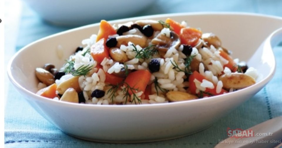 Bademleri kaynayan suya atıp 5 dakika bekledikten sonra ocaktan alın. Kabuklarını soyun. Yapışmaz yüzeyli bir tavaya alıp karıştırarak renkleri dönene dek kavurun. Kuş üzümünü sıcak suda 15 dakika bekletin. Sıvı yağı bir tavaya alıp, dilimlenmiş havuç ve mantarı kavurarak kenara alın. Pirinci yıkayıp süzün.