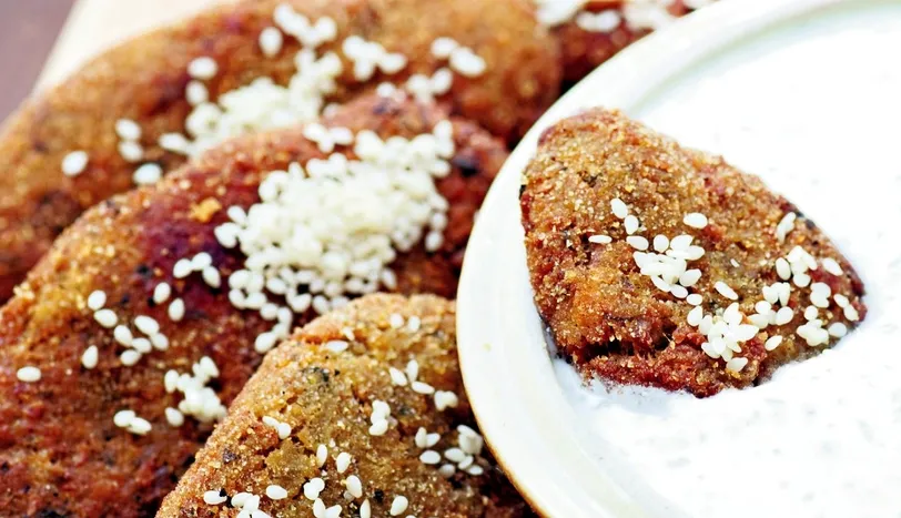 İÇ baklayı 24 saat suda dinlendirin. Kalan tüm malzemeyi blenderden geçirin. Baklanın suyunu süzüp, blenderdeki malzemenin üzerine ekleyin ve yeniden blenderden geçirin. Macun kıvamına gelen harçtan ceviz büyüklüğünde parçalar koparın. Elinizde şekil verip, kızgın sıvıyağda, altın rengi alana dek kızartın. Üzerine susam serpip, raita ile birlikte servis yapın.