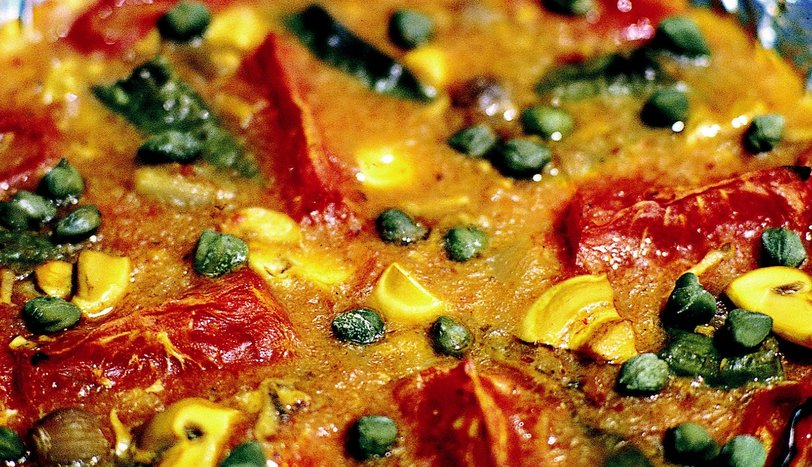 Üzerine 4 adet dilimlenmiş mantar, kapari, tuz, pul biber ve sivri biberleri yerleştirin. 200 derece fırında 20-25 dakika pişirip, servis yapın. - 2