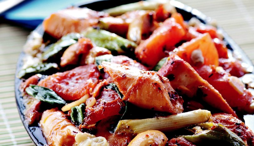 Tüm malzemeyi şöyle bir karıştırdıktan sonra kısık ateşte suyunu çekene kadar pişirin. Tavayı ocaktan alın ve soya sosunu koyup, beğendinin üzerine bu karışımı boşaltın. Sıcak servis yapın.