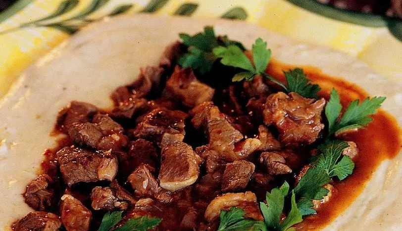 Eti ve yağı tencereye aktarın. Et suyunu çekene dek 8-10 dakika kavurun. Soğanı sarmısakla birlikte robotta kıyın. Kıyılmış soğan ve sarmısağı ete ilave edin. Ardından salçayı ve 1 tatlı kaşığı unu ekleyip, 3 dakika karıştırarak pişirin. Tuzunu ve karabiberini ayarlayın. En son olarak 5 su bardağı sıcak suyu katıp, yaklaşık bir saat kadar, az su kalana dek pişirin. Bu arada beğendi için konserve közlenmiş patlıcanları, ince olacak şekilde robotta kıyın. 1 çorba kaşığı tepeleme unu, tereyağda kavurup, sütü ilave ederek pişirin. Tuzunu ve karabiberini ayarlayın. Rendelenmiş kaşar peynirini ekleyin. Sütlü karışımı, pürüzsüz olması için blendırdan geçirin ve kıyılmış patlıcanlara ilave edip karıştırın. Hünkar beğendiyi servis tabağına alıp, yayın. Üzerine tas kebabını dökün. maydanozla süsleyip, sıcak servis yapın.