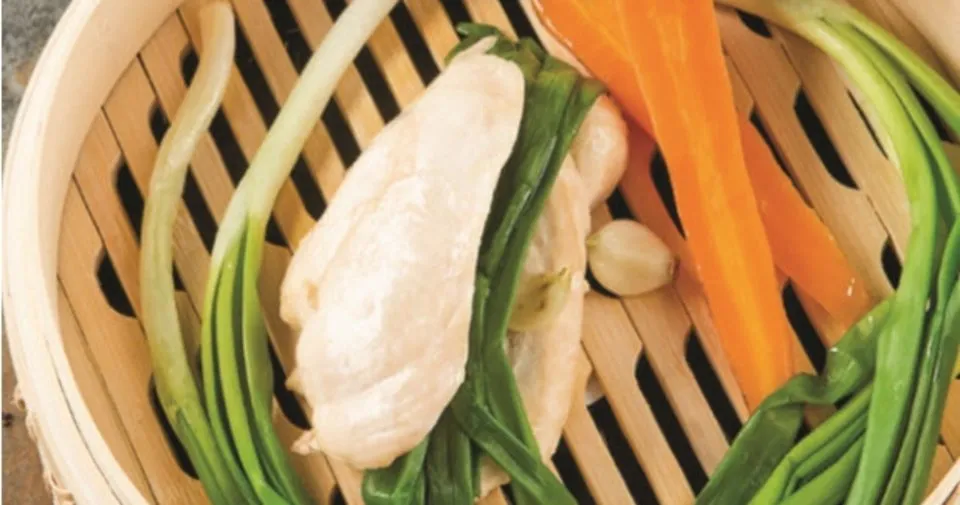 Karabiber, zeytinyağı ve tuzu karıştırıp, tavuk parçalarını bu karışımla iyice ovalayın. Daha sonra boylamasına ve cep şeklinde, birbirinden ayrılmayacak biçimde ortadan ikiye kesin. Aralarına tuz serpip, taze soğanların yeşil kısımlarını ve kabukları soyulmuş sarımsak yerleştirin. Pişirmek için buharda pişirici veya bambu buhar sepetine tavukları yerleştirin. Yanlarına soğanları, kabukları soyulmuş havuçları koyup, bambu sepet suya değmeyecek miktarda tencereye sıcak su ilave edin ve sepeti tencereye yerleştirin. Kapağını kapatıp, ocağa oturtun ve orta ateşte ara sıra kontrol ederek, tavuk yumuşayana dek pişirin.