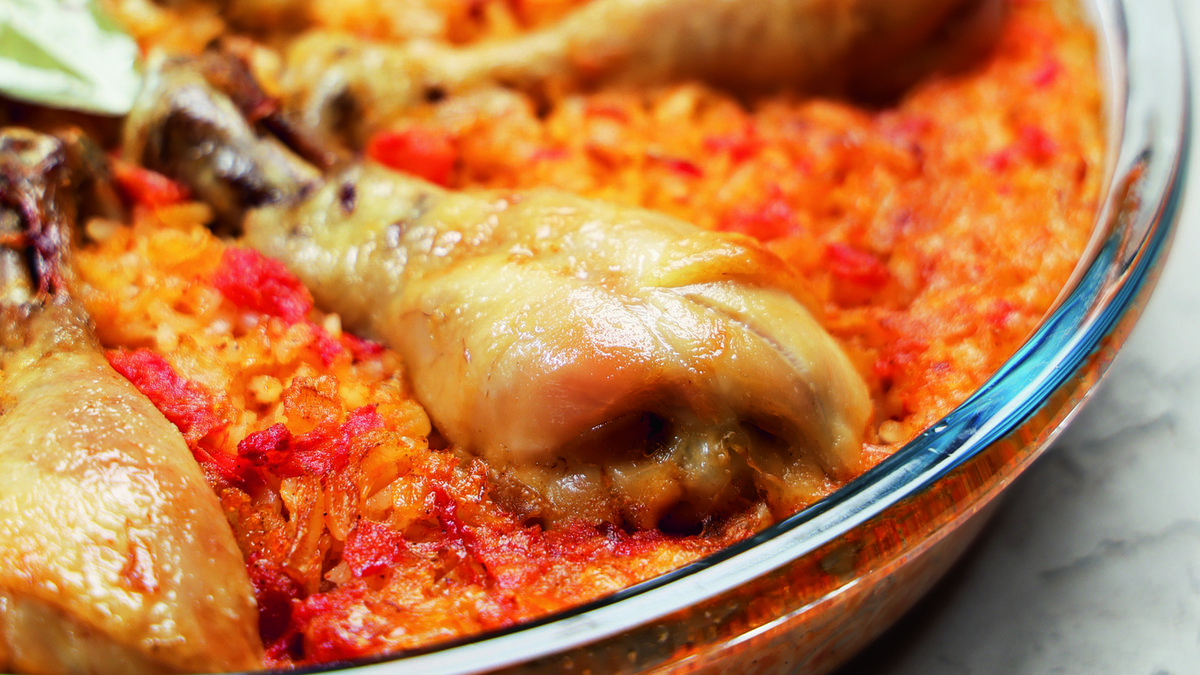 Yuvarlak bir fırın kabına tenceredeki pirinçli karışımı eşit şekilde yayın. Üzerine haşlanmış tavuk bagetleri yerleştirin. Ev yapımı domates sosu tavukların üzerine gazdirin.