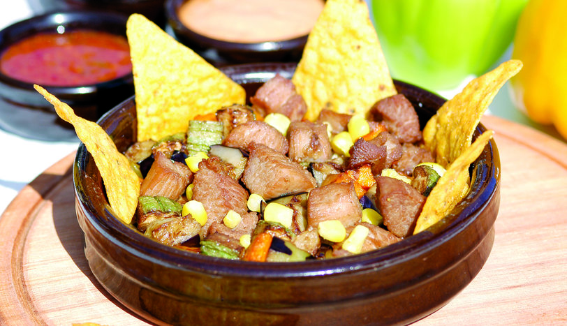 Derin bir tencereye eti koyun. Yağını salıp pembeleşinceye kadar kavurun. Soğan ve sarmısak ilave edip, birkaç dakika daha pişirin. Küp domates, baharat, un, tuz ve et suyu koyup, kısık ateşte 10 dakika kadar pişirin. Ocaktan aldıktan sonra, kimyon ilave edin. Güveçlere paylaştırın. Etrafına mısır cipslerini dizin. Düşük ısılı fırında cipsleri ısıtın. Üzerine krema ilave ederek servis yapın.