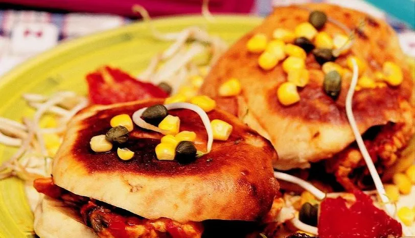Tavuk etlerini yıkayıp jülyen doğrayın. Yapışmaz yüzeyli tavada tavukları kavurup ocaktan alın. Domateslerin kabuklarını soyun. Küp küp doğrayıp geniş bir tavaya alın. Üzerine sıvıyağ, un, sıcak su ve salçayı ekleyip, karıştırarak kıvamlı bir hal alıncaya kadar pişirin. Tuz ve baharatlarla tatlandırıp tavukları ve soya sosunu ekleyin. Bütün malzemenin harmanlanması için karıştırın ve tavayı ocaktan alın. Pita ekmeklerini ortadan kesin. Dış yüzeylerini yağlayıp, yapışmayan tavada renkleri dönünceye kadar kızartın. Kaşar peynirini küp küp doğrayıp pidelerin içine paylaştırın. Üzerine mısır, acı sos ve kekik serpip açık şekilde önceden ısıtılmış fırına sürün. Peynir eriyince fırından çıkartıp içlerine tavuklu karışımı pay ederek kapatın. Yanında arzu ettiğiniz garnitürlerle birlikte servis yapın.