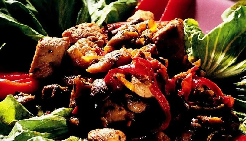 Yemeklik doğranmış soğanı zeytinyağında kavurun. Ardından kuşbaşı tavuk göğsünü ilave edip, kavurmaya devam edin. Kibrit çöpü biçiminde doğranmış sebzeleri ekleyin. Pişmesine yakın, ayrı bir yerde sosu hazırlayın. Bunun için bal, soya sosu, sirke ve hardalı karıştırın. Yemeğe ekleyin. Karıştırıp, 1-2 dakika daha pişirin. Kekik ve pulbiberi ekleyip, ocaktan alın ve sıcak servis yapın.