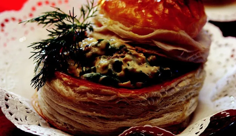 Milföy hamurlarından yuvarlak daireler çıkartın. Hafif su serptiğiniz ıslatılmış fırın tepsisine 4 adet daire şeklindeki hamuru yerleştirin. Diğer 4 adet daire şeklindeki hamurun ortasından, bir kalıp yardımıyla 8 cm' lik daireler çıkartın. Elde ettiğiniz ortası boş çember şeklindeki hamurları tepsiye koyduğunuz hamurların üzerine yerleştirin. Tepsinin boş kalan kısmına 8 cm' lik daire şeklindeki hamurları da dizdikten sonra hepsinin üzerine yumurta sarısı sürün. Önceden ısıtılmış 220 derece fırında 20 dakika pişirin. Çiroz filetoları orta derecede ısıtılmış fırın ızgarasında 2-3 dakika çevirerek pişirin. Daha sonra elle ufak parçalara bölün. Başka bir kapta tereyağını eritip, üzerine unu ilave ederek kavurun. Sonrasında karıştırarak yavaş yavaş sütü ekleyin. Sos koyulaşıncaya dek karıştırın. İçine çirozları, ufak doğradığınız çedar peynirini, ince şekilde doğradığınız dereotunu, muskatı, karabiberi ekleyerek kısık ateşte peynir eriyene kadar karıştırıp ocaktan alın. Fırından çıkarılan ve ortası kuş yuvası görünümü alan volovanların içine hazırladığınız sostan aldığı kadar doldurun. Pişen küçük daireleri üstlerine kapatarak servis tabağına alın. Aşçının notu: Çiroz ve peynir kullanıldığından tuz kullanılmayabilir