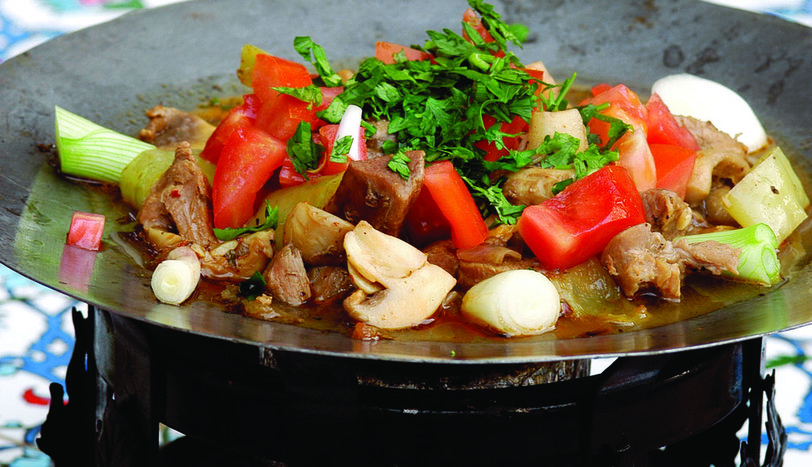 Et, soğan ve domatesleri kuşbaşı doğrayın. Tereyağını sac tavada eritip etleri ilave edin ve suyunu bırakmaması için, yüksek ateşte karıştırarak kavurun. Etlerin pişmesine yakın, doğradığınız soğan, sarmısak ve mantarları ilave edin. Soğanlar pişince domates ve biberleri ekleyin. Tuz ve karabiberini ayarlayıp karıştırın. Domatesler diriliklerini kaybedene kadar pişirin. Sac tavayı ocaktan alıp üzerine kekik serpin. Sıcak olarak servis yapın.