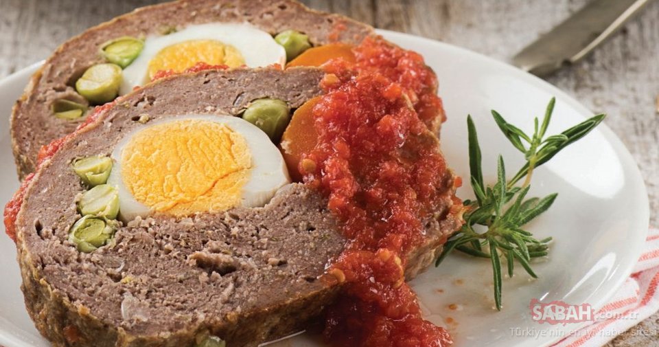 Düz bir zemine pişirme kağıdı serin. Üzerine harcı 1 parmak kalınlığında ve dikdörtgen olacak şekilde yayın. Ortasına soyulmuş yumurtaları arka arkaya ve tek sıra halinde yerleştirin. Bir yanına havuç diğer yanına da bezelye koyun. Rulo şeklinde sarın ve pişirme kağıdı serilmiş bir fırın tepsisine yerleştirin. Önceden ısıtılmış 180 derece fırında 40-45 dakika pişirin ve servis tabağına alın.