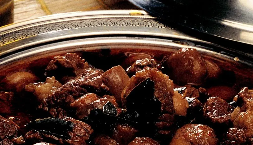 Eti bir tencereye alın. Suyunu çekene kadar kısık ateşte kavurun. Kavrulan etin üzerine defne yaprağı, reyhan, karabiber, kimyon ve pulbiber ekleyip karıştırın. Mantarları yıkayıp, kuru bir bezle iyice silin. Bütün olarak kavrulan eti üzerine ekleyin. Su, zeytinyağı ve soya sosunu ekleyin. Tencerin kapağını kapatıp, orta ateşte et yumuşayana kadar pişirin.