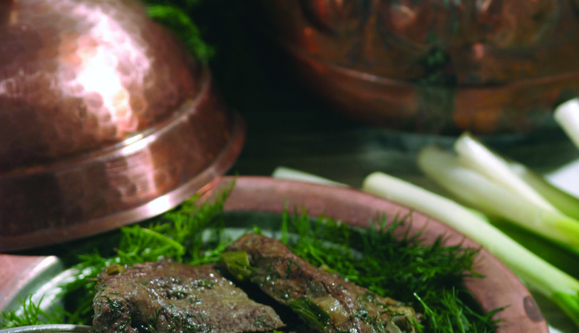 Ciğeri yaprak şeklinde dilimleyin. Isıya dayanıklı fırın kabına yağlı kağıt serin. Zeytinyağı ile yağlı kağıdı yağlayın. Ciğerleri yerleştirin. Üzerlerine ve aralarına ince kıyılmış dereotu ve taze soğanları yayın. Dövülmüş sarmısak, karabiber, kimyon ve tuz serpin. 15-20 dakika bekletin. Önceden ısıtılmış 200 derece fırında pişirin.AŞÇININ NOTUAynı işlemi tavada da gerçekleştirebilirsiniz.