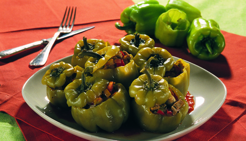 KIRMIZI biber, sarı biber, domates ve mantarları küp küp doğrayın. Doğranmış soğan ve sarmısağı, sıvıyağda 4 dakika kavurun. Üzerine ince doğranmış tavuk etini ekleyin. Ardından küp doğranmış sebzeleri katıp, tuzunu ve karabiberini ayarlayın. Kendi suyu ile 20 dakika kapağı kapalı olarak pişirin. Dolmalık yeşil biberlerin kapaklarını kesip içlerini temizleyin. Pişen iç malzemeyi dolmalık yeşil biberlere pay ederek doldurun. Üzerlerini kapaklarıyla kapatıp tencereye dizin. Sıcak suyu ekleyip tencerenin kapağını kapatın ve 20 dakika pişirin. Servis yapın.