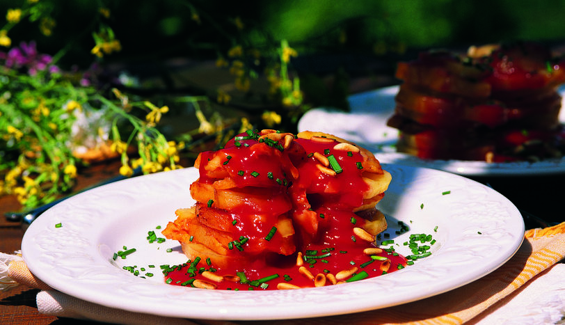 PATATESLERİN kabuklarını soyup ince halka şeklinde doğrayın. Fırın tepsisine 2 çorba kaşığı sıvıyağı sürüp, halka patatesleri yan yana dizin. Birinci kat patatesleri dizdikten sonra üzerine rendelenmiş kaşar peynirini serpin. Tekrar halka patatesleri dizin. Bir kapta süt, margarin ve baharatları çırpın. 1 su bardağı suyu ilave edin ve bu karışımı patateslerin üzerine dökün. Tepsinin üzerini folyo ile kaplayıp 180 derece fırında 30 dakika pişirin. Bu arada domates püresini ve kalan 1 su bardağı suyu bir kaba alıp, bir taşım kaynatın. Mısır nişastasını suyla ezip sosa ilave edin ve bir taşım daha kaynatın. Dövülmüş sarmısağı da ekleyip karıştırın. Sosu ocaktan indirin. Dolmalık fıstığı yapışmaz yüzeyli tavada 3 dakika kavurun. Servis tabağına halka patatesleri kat kat dizin. Üzerine sosu döküp, fıstıkları serpiştirerek servis yapın
