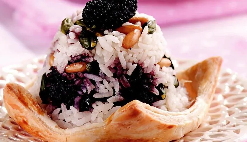 Pirinci tuzlu sıcak suda 10 dakika dinlendirip, fazla suyunu süzdürün. Dolmalık fıstığı tereyağında kavurun. Fıstığı tereyağından alıp, kenara ayırın. Tereyağına pirinci ekleyip kavurun. Üzerini geçecek kadar sıcak su, tuz ve karabiber ilave edin. Ağır ateşte pilav göz göz olana dek pişirin. Dolmalık fıstık ve antep fıstığını ekleyin. Tahta kaşıkla karıştırın. Üzerine kağıt havlu örtüp, tencerenin kapağını kapatın ve 10 dakika dinlendirin. Isıya dayanıklı 10 adet küçük kasenin içine, aralarına kara ve beyaz dut dizerek pilavı kat kat yerleştirin. Kaselerin ağızlarını kare şeklindeki milföy hamurlarıyla kapatıp, fırın tepsisine koyun. Önceden ısıtılmış 180 derece fırında milföyler pembeleşene dek pişirin. Servis tabaklarına kaseleri ters çevirip çıkarın. Sıcak olarak servis yapın.