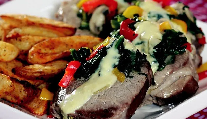Nuar, kabukları soyulmuş havuç, soğan, patates ve maydanozu 4 su bardağı suda 10 dakika haşlayıp, maydanozu çıkarın. Etler yumuşayana kadar haşlandıktan sonra nuarları sudan çıkarın. Sebzeleri suyla birlikte mikserden geçirip bir kenara alın. İnce kıyılmış ıspanak yaprağı, soğan, mantar, kırmızı biber, sarı biber, tuz ve karabiberi 1 çorba kaşığı zeytinyağında kavurun. Servis tabağına bir sıra nuar, bir sıra sebze olmak üzere yerleştirin. Sos için süt, yumurta sarısı, 1 çorba kaşığı esmer un, tuz ve karabiberi karıştırarak ağır ateşte pişirin. Hazırladığınız etlerin üzerine dökün. Elma patateslerin üzerine tuz, karabiber, pul biber serpin. Önceden ısıtılmış 200 derece fırında 15-20 dakika pişirip sebzeli nuarla birlikte servis yapın.
