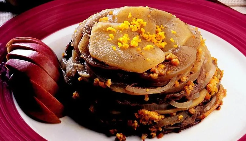 KUZU etini ince ince dilimleyin. Patatesleri soyup ince halkalar halinde doğrayın. Elmaların çekirdek yataklarını çıkardıktan sonra dilimleyin. Portakal kabuğu rendesini bir kaba alıp üzerine adaçayı, karabiber ve tuz ekleyip harmanlayın. Soğanı halka doğrayıp kenara alın. Yuvarlak ve küçük bir fırın kabını çok az yağlayıp, patateslerin bir kısmını kaba yerleştirin. Üzerine portakallı karışımdan serpin. Elma dilimlerini dizip üzerine soğan halkası koyun. En üste et dilimi yerleştirin. Her kata portakallı karışımdan serpin. Malzemeniz bitene kadar bu şekilde devam edin. En üstte kalacak patates ve elma dilimlerini ortası boş kalacak şekilde yerleştirin. Elma ve portakal suyunu karıştırıp yemeğin ortasındaki boşluktan dökün. Fırın kabının üzerini alüminyum folyo ile kapatın. Önceden ısıtılmış 200 derece fırında 1.5 saat pişirin. Üzerini açıp yeniden fırına verin. Yarım saat daha pişirin. Fırın kabını servis tabağına ters çevirerek çıkardıktan sonra ikram edin.