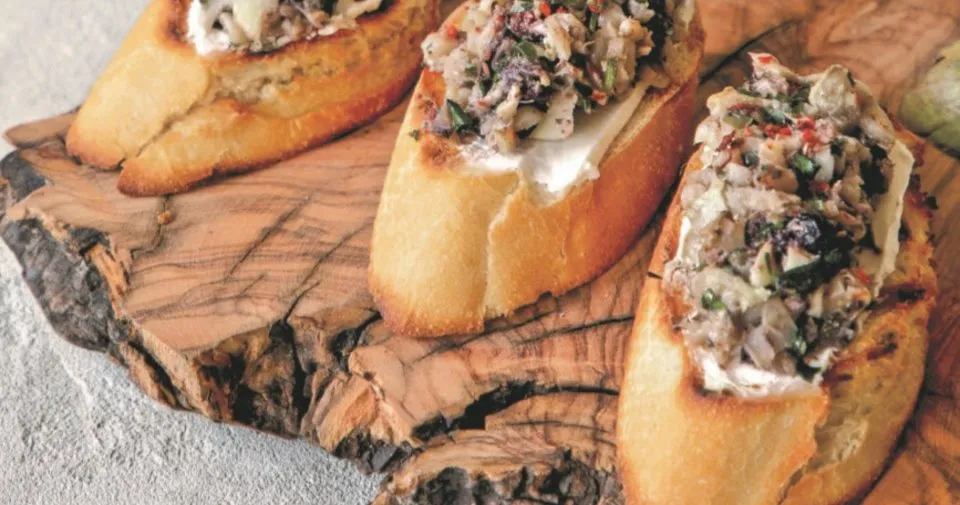 Enginarları yayvan bir tencereye yerleştirin. 3 çorba kaşığı zeytinyağı, su, 1 çorba kaşığı limon suyu ve tuz ilave edip kapağını kapatın ve enginarlar yumuşayana dek pişirin. Baget ekmeği dilimleyip, fırın tepsisine yerleştirin ve üzerilerine 3 çorba kaşığı zeytinyağını sürün. Önceden ısıtılmış 180 derece fırında kızartın. Enginarların suyunu süzüp püre haline getirmeden parçalı kalacak şekilde blenderden geçirin ve derin bir kaba alın. Çekirdekleri çıkarılmış zeytin, sarmısak, maydanoz ve kapariyi blenderden geçirip, enginarla karıştırın. Parmesan peyniri ilave edip harmanlayın. Ayrı bir yerde kalan zeytinyağı, kalan limon suyu, pul biber ve tuzu çırpın. Enginarlı harca ilave edip karıştırın. Ekmeklerin üzerilerine labne peyniri sürüp, enginarlı harcı pay ederek yayın ve servis yapın.