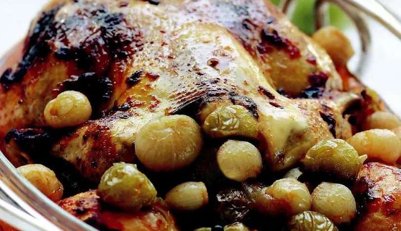 TAVUĞU temizleyip, yıkayın. Derin bir kapta sıvıyağ, salça, limon suyu, tuzu karıştırıp tavuğun içine ve dışına sürün. Fırın tepsisine alın. Tavuğun içine arpacık soğan ve eriklerin bir kısmını yerleştirin. Kalan arpacık soğan ve erikleri tavuğun yanına dizip, karabiber serpiştirin. Sıcak su ekleyip, önceden ısıtılmış 150 derece fırında kontrol ederek pişirin. Sıcak olarak servis yapın.