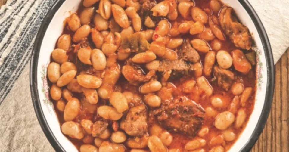 Kurufasulyeyi yıkayıp tencereye alın ve üzerini dört parmak geçecek kadar su ilave edip 1 gece dinlendirin. Ardından suyunu süzüp, üzerini üç parmak geçene kadar su koyun. Kaynamaya başlayınca üzerinde oluşan köpükleri ara sıra bir kepçe yardımıyla alıp atın. Ocaktan alıp, tencerenin kapağı kapalı olarak kenarda bekletin. Soğanı yemeklik, kabukları soyulmuş domatesi küp doğrayın. Sıvı yağı veya tereyağını başka bir tencereye alıp ısıtın. Eti ekleyip birkaç kez çevirin. Etin rengi döndüğünde, soğanı ilave edip hafifçe soteleyin. Domates, salça, doğranmış biber ve sıcak suyu ekleyip pişirin. Sıcak suyun içinde bekleyen fasulyeyi suyu ile birlikte etin bulunduğu tencereye katın. Kısık ateşte yumuşayana kadar pişirin. Ateşten almaya yakın tuzunu katıp, ocaktan alın ve 15 dakika dinlendirin. Sıcak olarak servis yapın.