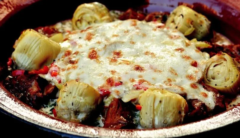 Tavaya aldığınız 2 çorba kaşığı tereyağında mantar, ince kıyılmış soğan, sivri biber ve ortadan ikiye böldüğünüz enginar kalbini soteleyin. Kremayı ilave edin ve karıştırın. Diğer tarafta eti küp doğranmış domatesle birlikte bir tavaya alın. Kendi suyunda karıştırarak pişirin ve enginar kalpli karışımın içine ekleyin. 1-2 kez çevirdikten sonra tavayı ocaktan alın. Ayıklanmış ve yıkanmış ıspanağı incecik kıyın. Kalan 1 çorba kaşığı tereyağını bir tavaya alın ve ıspanağı bu yağda soteleyin. Un ve sütü ilave edip, ıspanak püre kıvamına gelene kadar pişirin. Orta büyüklükte bir güveç kabının içine ıspanak püresini yerleştirin. Üzerine etli enginar karışımını alın. En üste rendelenmiş kaşar peynirini serpin. Önceden ısıtılmış 180 derece fırında kaşar peyniri eriyene kadar pişirin. Sıcak olarak servis yapın.