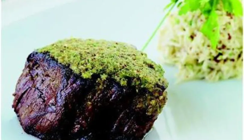 3. Biftekleri bir fırın tepsisine koyun ve kabuk karışımını her bir bifteğin üzerine bir kaşık sürün. 180ºC fırında üstü açık olarak, kabuk sertleşene dek 5 dakika pişirin .