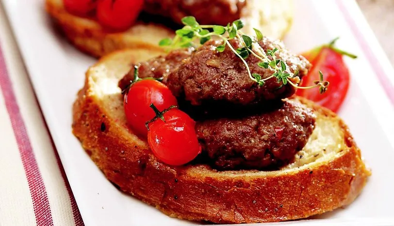 Köfte için kıymayı geniş bir kaba alıp, üzerine rendelenmiş soğan, suya batırılıp sıkıldıktan sonra ufalanmış ekmek içi, biber salçası, su, tuz, karabiber, kimyon ve yenibahar ilave edip yoğurun. Harçtan küçük mandalina büyüklüğünde parçalar koparıp, oval köfteler hazırlayın. Sıvı yağda köfteleri yarı yarıya kızartıp kenara alın. Et suyunu ısıtıp, içine karabiber ve pul biber ekleyin. Ekmek dilimlerinin her iki yüzünü de et suyuna batırıp, yağlı kağıt serilmiş fırın tepsisine dizin. Üzerlerine köfteleri yerleştirin. Önceden ısıtılmış 180 derece fırında ekmekler suyunu çekip, köfteler kızarana dek pişirip, servis yapın.