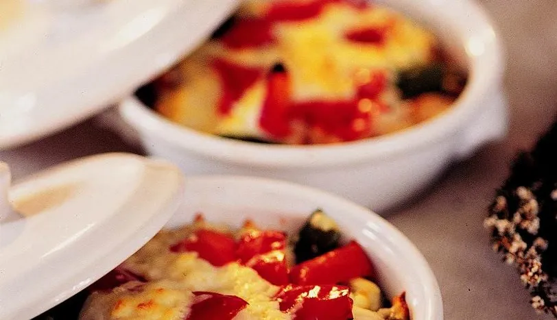 Tavuk göğsünü kemiklerinden ayırıp kuşbaşı doğrayın. Yarım çay bardağı sıvıyağda etleri, renk değiştirip yumuşayana dek ara sıra karıştırarak soteleyin. Akşamdan suya yatırılmış kayısıları tavla zarı iriliğinde doğrayarak etlerin üzerine ekleyin. 3-4 dakika daha soteleyin. Tuzunu ve karabiberini ayarlayıp ateşten alın. Konserve bezelyelerin suyunu süzerek bir kaba alın. Ardından iri dövülmüş cevizi katın. İyice harmanlayın. Bezelyeli malzemeyi tavuklu malzemeyle karıştırın. Bir fırın kabına veya tek kişilik fırın kaplarına yayın. Salçalık kırmızı biberleri yarıdan kesip tavuklu malzemenin üzerine yerleştirin. Sosu için, küçük bir tavada 1 kaşık margarini eritip üzerine unu ekleyin. Hafifçe sararana dek unu hızla karıştırın. Üzerine soğuk sütü ve tuzu ekleyin. Çırpma teliyle sürekli karıştırıp, koyulaşana dek pişirin. Sosu ateşten alıp, tavuklu malzemenin üzerine gezdirerek yayın. Rendelenmiş kaşar peynirini serpin. Isıtılmış 200 derece fırında, peynirler eriyene dek pişirin. Sıcak servis yapın.