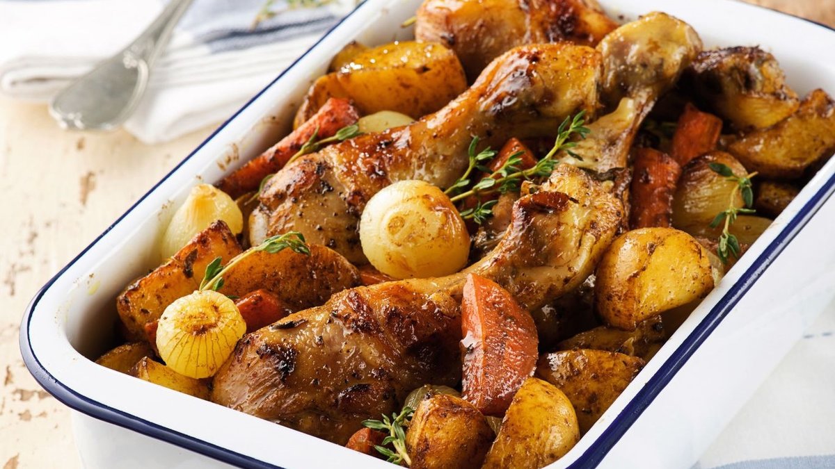 Tavuk butlarını fırın kabına alın. Havuçları soyup irice doğrayın. Patatesleri kabuklu olarak büyüklüklerine göre ikiye veya dörde bölün. Arpacık soğanları temizleyin. Tüm sebzeleri tavuğa ekleyin. Kekik, balzamik sirke, hardal, köri, tuz ve karabiber ilave edip harmanlayın.