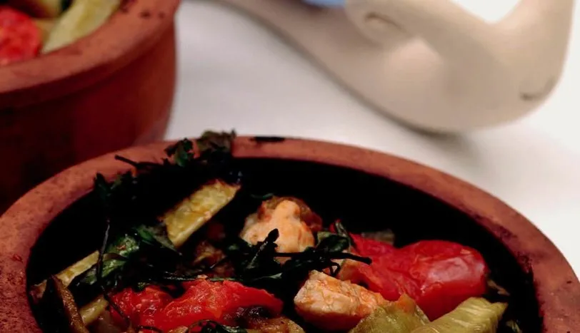 PATLICANLARI alacalı soyup, tuzlu suda acısını çıkarın. Kağıt havlu üzerinde kurutun. Tüm malzemeleri küp şeklinde doğrayın. Yemeklik doğranmış soğanı sıvıyağda hafif kavurun. Küçük doğranmış tavukları ve fasulyeyi ilave edin. 5 dakika kavurduktan sonra küp şeklinde doğranmış 2 domatesi ilave edin. 5 dakika daha kavurduktan sonra kabak, patlıcan, tuz ve baharatı ilave edip bütün malzemeyi karıştırın. Hafif sulu olmasını istiyorsanız bir bardak su ekleyebilirsiniz. Yemeği güveçlere eşit miktarda yerleştirin. Üzerini dilimlenmiş biber, domates ve maydanoz ile süsleyin. Önceden ısıtılmış 170 derece fırında pişirin.